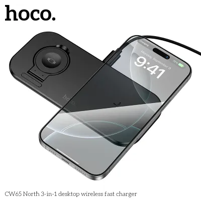 The Hoco CW65 15W 3-in-1 Ultra Thin North Tabletop Wireless Fast Charger is a modern and convenient charging solution for your smartphone, wireless earbuds, and Apple Watch.